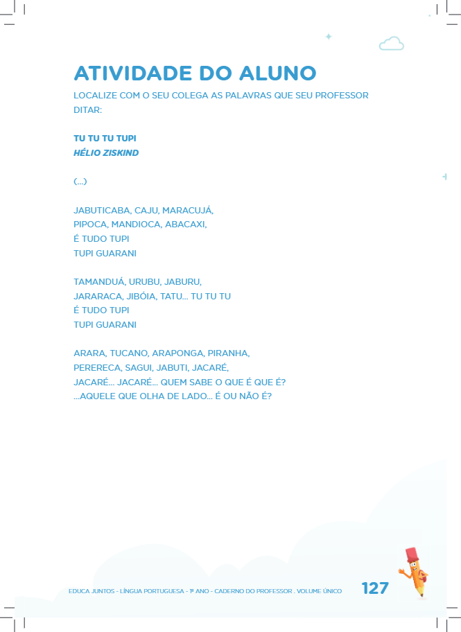 - Materiais necessários: estrofe da música “Tu Tu Tu Tupi”, textos informativos presentes na Coletânea de Atividades: Educa juntos : língua portuguesa / Secretaria de Estado da Educação e do Esporte. – Curitiba : SEED – PR, 2019. – 210 p. (Caderno de orientações didáticas para o professor ; primeiro ano).