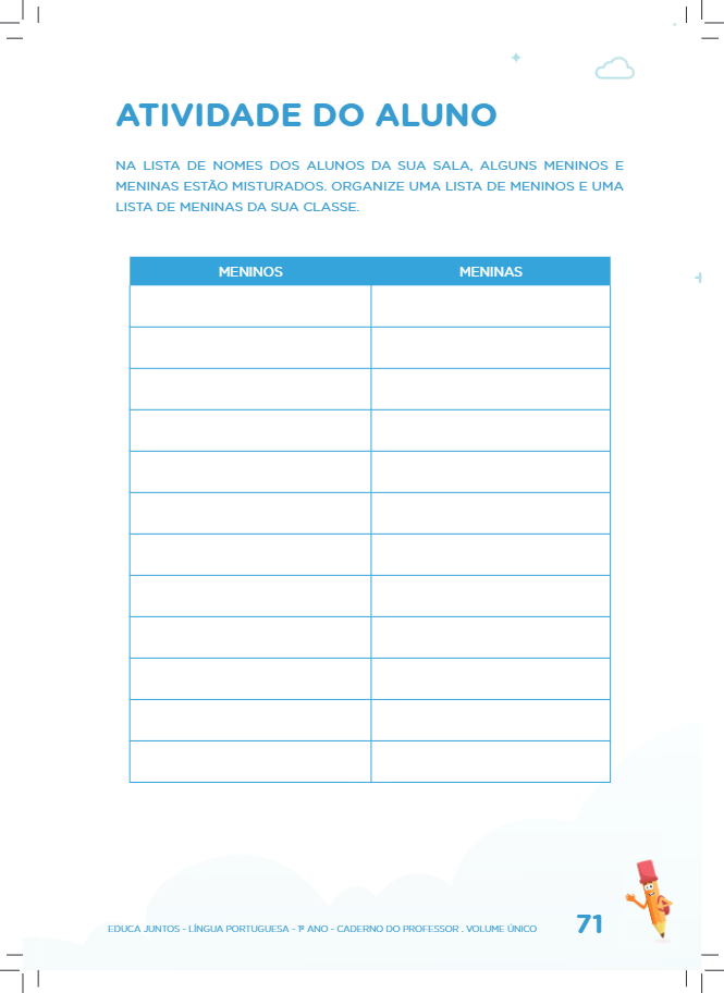 - A mesma atividade pode ser realizada semanalmente ou o mesmo procedimento ser usado para construir outras listas: a de encarregados pela biblioteca de classe (responsável pelo registro de empréstimos de livros), a de aniversariantes do mês ou ainda a lista dos alunos que usam o transporte escolar.