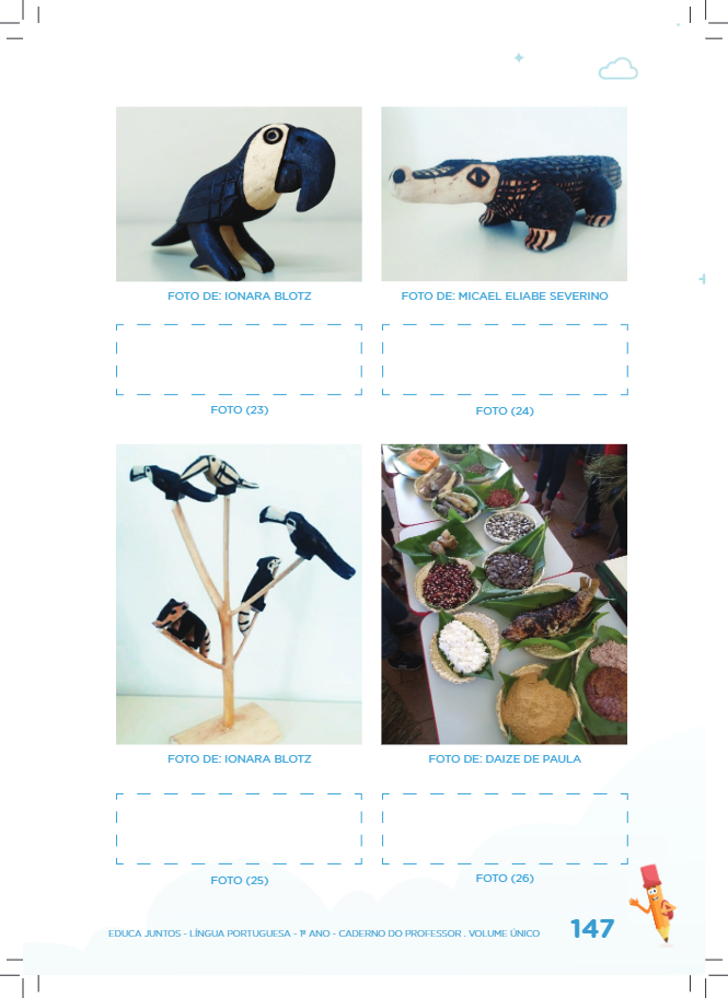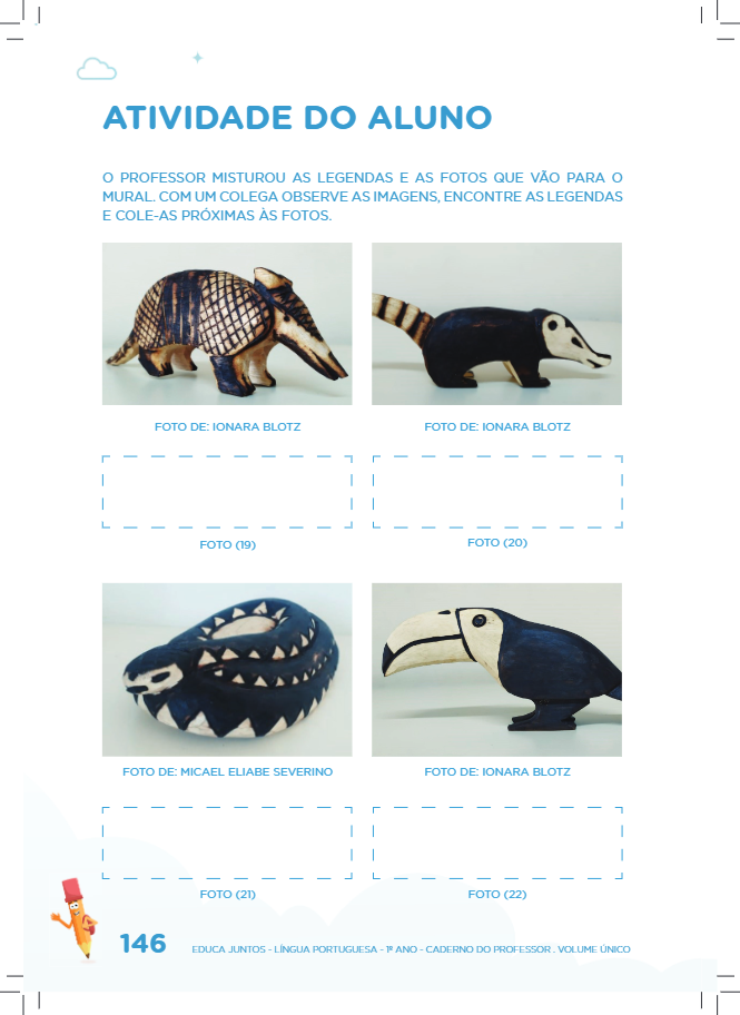 • No primeiro momento explore as imagens com as crianças. Questione: Pertencem a um povo específico? Do que é feito? O que representa? Quantos animais vê? Quais? Vocês conhecem algum desses animais? Esses animais podem ser criados em casa? Depois, com foco em uma imagem comece solicitando às crianças dicas de como buscar o texto correspondente. Por exemplo: A partir da observação da primeira imagem o que acham que pode conter na legenda? Eles poderão dizer o nome do animal, do objeto, do que é feito, por qual povo indígena é feito. Depois que as crianças se aproximarem do conteúdo da legenda peça que busquem nos textos “onde diz” aquele nome. Esse procedimento poderá ser feito para cada uma das imagens. Isso auxiliará as crianças nas estratégias de leitura e localização das legendas pelas crianças.