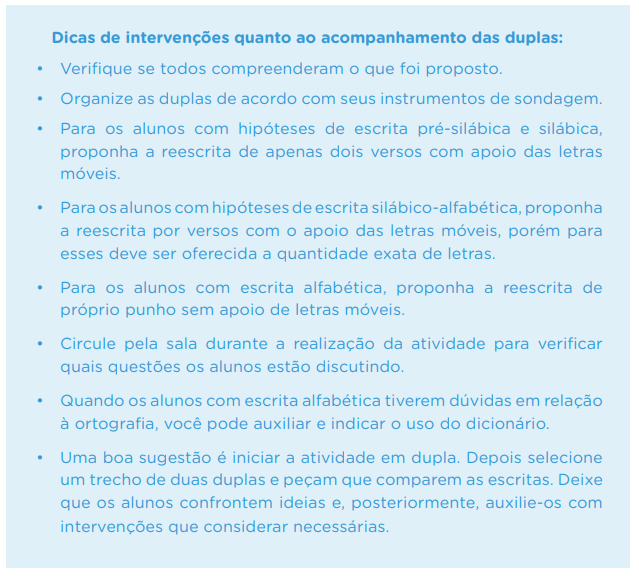 - Circule pelas duplas para ajudar, problematizar, perguntar, de forma que suas intervenções considerem as necessidades de avanço de cada dupla e contribuam para que pensem sobre as escolhas e decisões que tomaram, mesmo quando acertadas, e, assim, avancem em relação à apropriação do sistema de escrita.
