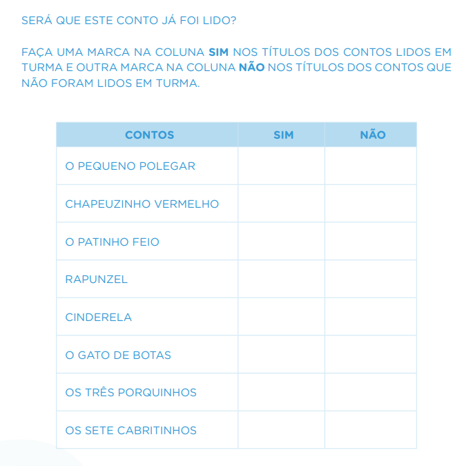 – Para aqueles que ainda não escrevem alfabeticamente, explique que precisarão localizar na lista os títulos que você for ditando e fazer uma marca na coluna SIM para os contos que já foram lidos na classe e outra marca na coluna NÃO para os contos que não tiverem sido lidos por você.