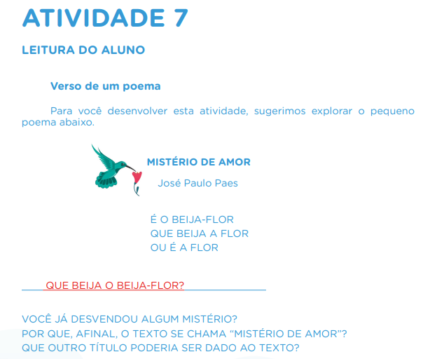 - Materiais necessários: poema “Mistério de Amor”, sem o último verso, da Coletânea de Atividades do Aluno.