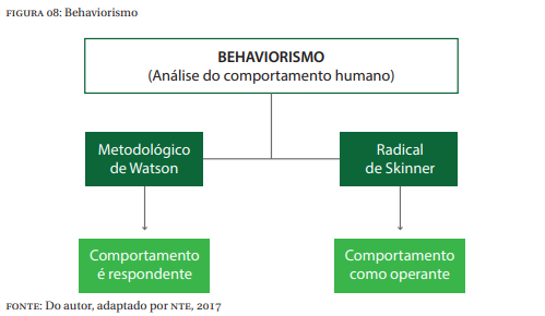 Então, perceba, que a mente humana, ou o aprendizado, visto por John Locke como tábula rasa, passa para a lei de estímulo resposta de Pavlov e posteriormente por Watson, onde o comportamento é visto somente como respondente ao estímulo. Até chegarmos à teoria que entendia o ser humano em três dimensões, de Skinner, onde o comportamento é operante e o homem interage com o ambiente. Portanto, falar de behaviorismo é de certa forma complicado, pois cada pensador, em cada época, a consolida de maneira diferenciada. Para entendermos mais a diferença das teorias de Watson e Skinner, ambas Behavioristas.