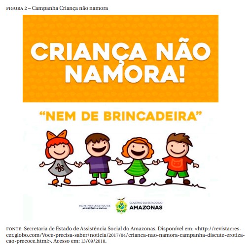 Falas como essa são tão comuns que a Secretaria de Assistência Social do Amazonas lançou a campanha “Criança não namora!”. (Figura 2). A ação teve grande repercussão nas redes sociais e contou com o apoio do Conselho Nacional de Justiça e outras entidades.