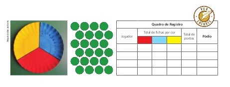 – 1 disco-tabuleiro mágico tripartido nas cores vermelha, azul e amarela (pode ser adaptado com pratinhos de aniversário) – 24 fichas circulares – 1 quadro para registro dos resultados