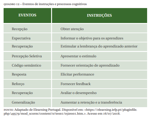 Logo, tais eventos servem para satisfazer ou fornecer as condições necessárias para o aprendizado e servir como base para criar instruções e selecionar os meios apropriados para que ocorra a aprendizagem (GAGNÉ, 1987).