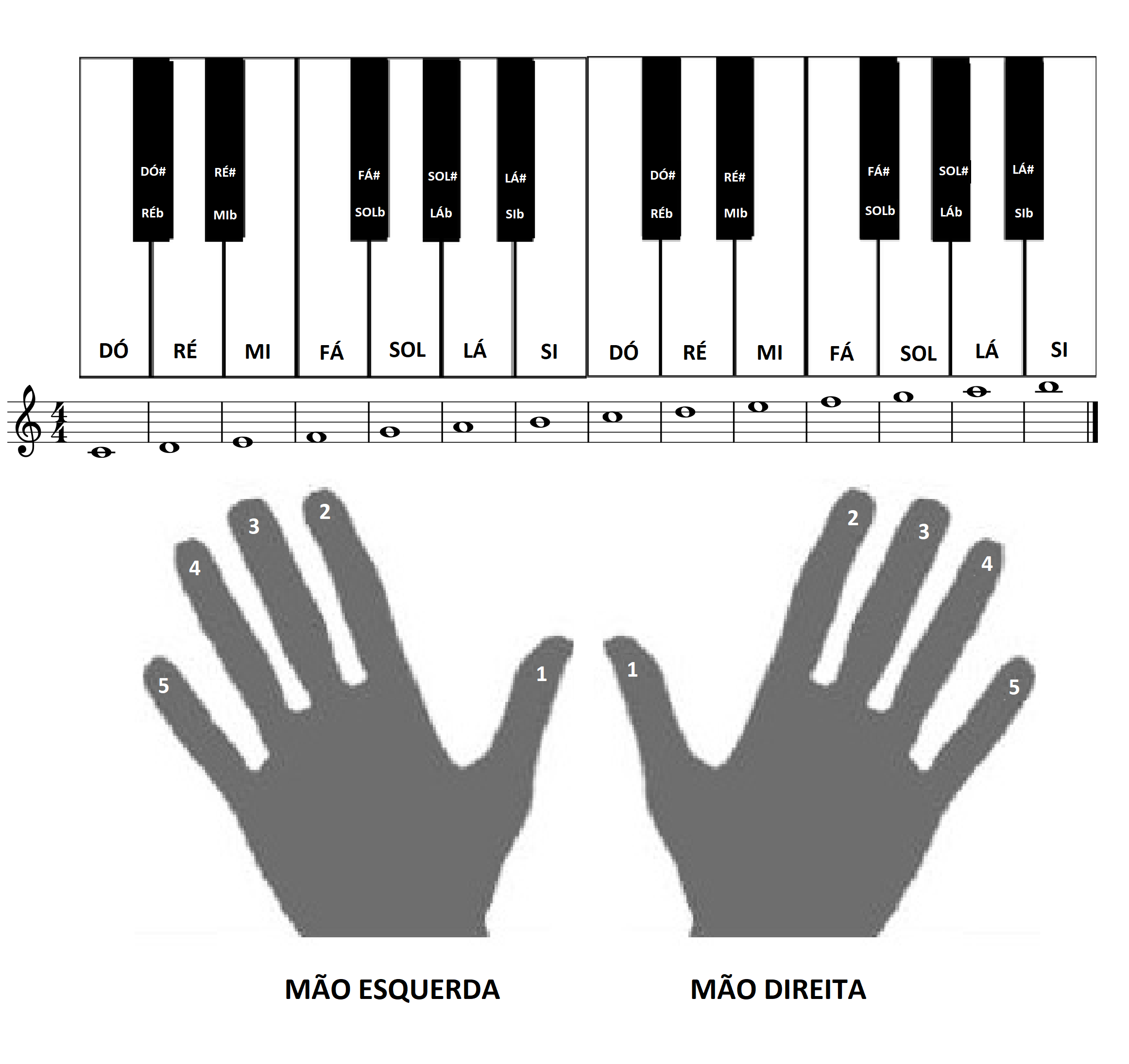 O teclado é composto por teclas brancas e pretas, que se repetem em um padrão específico ao longo de todo o instrumento. As teclas brancas correspondem às notas naturais (Dó, Ré, Mi, etc.), enquanto as teclas pretas representam as notas acidentadas (sustenidos e bemóis). Cada grupo de sete teclas brancas, de Dó a Si, forma uma oitava. As teclas pretas estão dispostas em grupos de dois e três, facilitando a localização das notas.