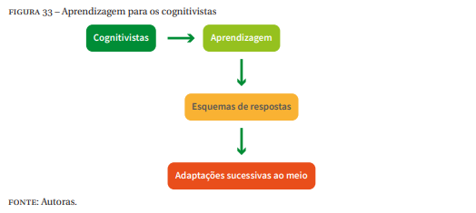 O modo que o questionamento e a abordagem cognitivista da aprendizagem divergem do ponto de vista do comportamentalista, se dá pelo fato de destacar a complexidade inerente a este processo e de se centrar nos processos mentais que ocorrem para que a aprendizagem tenha lugar (MIZUKAMI, 1986). Contudo para os cognitivistas a aprendizagem é estruturada e idealizada como um processo de aquisição de esquemas de resposta e de adaptações sucessivas ao meio, conforme Figura 33.