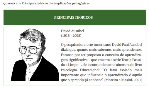 Com o passar de décadas vários filósofos e teóricos desenvolveram contribuições atendendo à complexidade dos processos cognitivos, porém, nunca nenhum teórico finalizou nenhuma teoria, mas eles conseguiram chegar a várias concepções diferentes dentro das teorias cognitivas. No Quadro 11 são apresentados os principais teóricos David Ausubel e Robert Gagné das implicações pedagógicas.