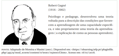 Logo, tais eventos servem para satisfazer ou fornecer as condições necessárias para o aprendizado e servir como base para criar instruções e selecionar os meios apropriados para que ocorra a aprendizagem (GAGNÉ, 1987).