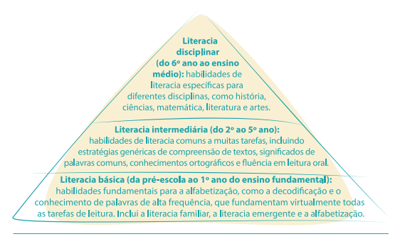 No segundo nível, está a literacia intermediária (do 2º ao 5º ano do ensino fundamental), que abrange habilidades mais avançadas, como a fluência em leitura oral, que é necessária para a compreensão de textos. No topo da pirâmide (do 6º ano ao ensino médio), está o nível de literacia disciplinar, onde se encontram as habilidades de leitura aplicáveis a conteúdos específicos de disciplinas, como geografia, biologia e história.