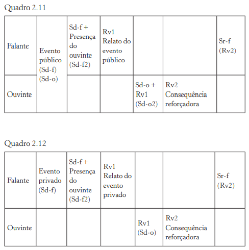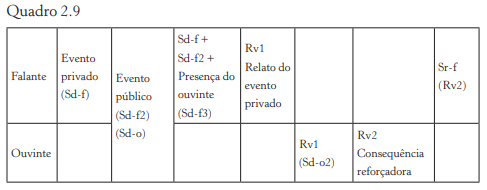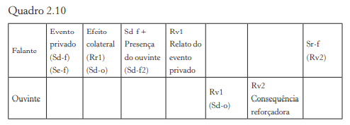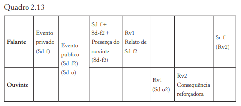 Nesse caso, temos um evento privado (Sd‑f), um evento público (Sd‑f2) e a presença do ouvinte (Sd‑f3) estabelecendo a ocasião para a ocorrência da resposta do falante (Rv1). O ouvinte, por sua vez, fica sob controle da resposta do falante (Sd‑o2) e do evento público que também fez parte da ocasião em que a resposta do falante ocorreu (Sd‑o). Dessa forma, embora o ouvinte não tenha acesso ao evento privado (Sd‑f), o controle é possível graças ao acompanha‑ mento do evento público.