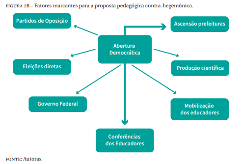 A pedagogia busca equacionar, de alguma maneira o problema da relação entre educador-educando, de modo geral, ou, no caso específico da escola, sempre buscando orientar o processo de ensino e aprendizagem. Seguindo o pensamento e estudos de Saviani (2013) iremos abordar e identificar as formulações contra-hegemônicas ou as pedagogias de esquerda. Com o processo de abertura democrática, eis que um conjunto de fatores que marcaram a década de 1980 como um momento privilegiado para a emersão de propostas pedagógicas contra-hegemônicas, conforme esquema na Figura 28.