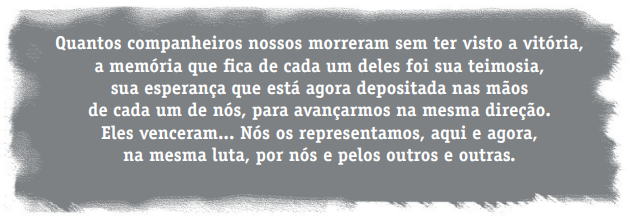 Na história, por vezes, a grande vitória será apenas a de se ter resistido e lutado sempre, lado a lado, todos os dias e a cada segundo. Exprime, assim, o grande grito de rebeldia contra a dominação. Luta de todos e todas, que nos confere um rosto humano junto a todos os outros homens e mulheres.