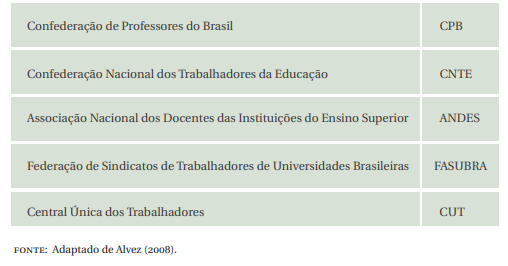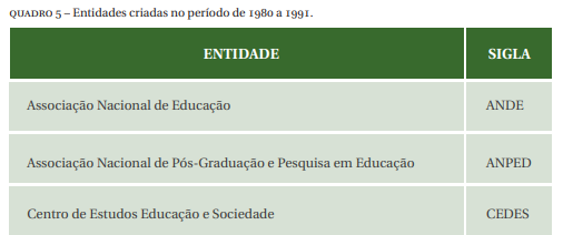 No Quadro 5 apresenta-se as entidades com suas respectivas siglas, surgidas no processo de luta dos educadores (ALVEZ, 2008).