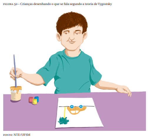 Para Vygotsky apud Resende (2009) a forma como as escolas realizam o processo da escrita, é completamente errado, criticando o ato mecânico, onde o educador exigi que as crianças desenhem as letras e construam palavras sem ensinar a linguagem escrita (RESENDE, 2009). Sendo assim, para ele, é ignorado os aspectos psíquicos da criança, ainda segundo o autor Vygotsky defende que, para escrever, as crianças devem entender a linguagem falada; sua incursão na escrita ocorrerá quando elas perceberem que podem também desenhar o que se fala, Figura 50.