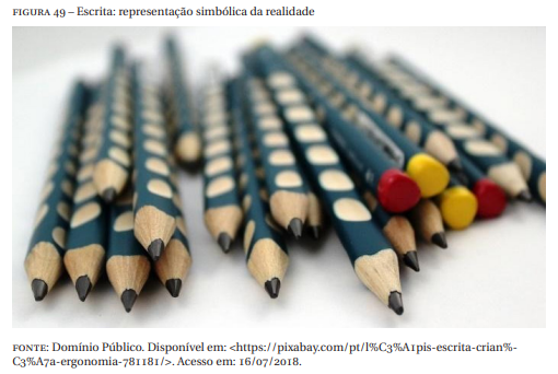 A escrita é um produto cultural, construído historicamente, que vai além do domínio da grafia, na Figura 49 os lápis estão representando a escrita, que “é um sistema de representação simbólica da realidade, a qual medeia a relação dos homens com o mundo” (RESENDE, 2009, s/p.).
