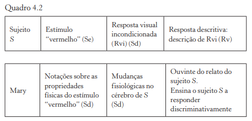Por outro lado, através de um monitor preto e branco, Mary tem acesso às modificações que ocorrem no cérebro do sujeito S e ela sabe quais são as modificações fisiológicas específicas causadas por estímulos visuais “vermelhos”, o que torna possível a ela estabelecer correlações entre estimulações “vermelhas” e respostas visuais eliciadas por elas. A situação que controla o comportamento verbal da cientista Mary e faz com que ela afirme que o sujeito S está vendo algo “vermelho”, portanto, são essas notações sobre as características físicas dos estímulos e seus efeitos sobre a fisiologia cerebral de S. Trata‑se da situação exposta no Quadro 4.2.
