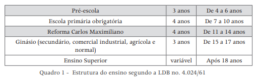 A Lei privilegiou os estabelecimentos de ensino particulares, omitindo o dever do Estado de disponibilizar ensino gratuito, previsto pela Constituição de 1946. Estabeleceu também o princípio da equivalência para os cursos do ensino médio (secundário e técnico), com articulação horizontal (possibilidade de mobilidade entre os cursos) e vertical (acesso ao ensino superior mediante aprovação em exame vestibular).A Educação Nacional