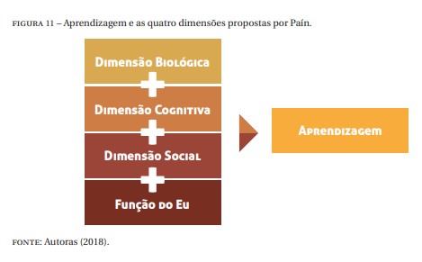 Não ocorre de modo isolado, é abrangente por envolver “um momento histórico, um organismo, uma etapa genética da inteligência e um sujeito associado a outras estruturas teóricas”, que constituem material de estudo do “materialismo histórico, à teoria piagetiana da inteligência e à teoria psicanalítica de Freud” (PAÍN, 1985, pág. 15). Assim, a autora apresenta quatro dimensões que envolvem os processos de aprendizagem, conforme Figura 11