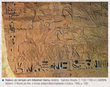 Quanto mais importante o personagem, maior o espaço que sua representação ocupa na parede, obedecendo-se à seguinte hierarquia: primeiro o Faraó, em seguida sacerdotes, depois militares, camponeses e por último escravos. Observe este baixo relevo. Nele fica fácil observar como foi utilizada a lei da frontalidade nos personagens humanos. Observe que na parte superior há uma pessoa maior que representa o rei Ramsés II caçando touros selvagens. Ele usa um arco e uma flecha e há um risco representando o trajeto de uma flecha até a parte traseira de um touro que corre para a mata. Veja que Ramsés II não está correndo, mas apoiado em uma espécie de charrete presa a um cavalo. É interessante destacar que os cavalos não são provenientes do Egito, quem os levou para lá foram povos chamados hicsos, entre 1750 e 1580 a.C.