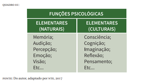Pode-se dizer que, a teoria de Vygotsky é sociocultural enquanto que a teoria de Piaget é interacionista, com menos ênfase no social. Vygotsky também afirma que, temos processos superiores e processos elementares da atividade psicológica, sendo que, o processo superior é aquele que possibilita pensar objetos ausentes, refletir sobre o passado ou planejar ações futuras. E os processos elementares são ações automatizadas, como os de associação simples entre eventos. Já a internalização, por sua vez, constitui a transformação das marcas externas em processos internos de mediação. O quadro 01 ilustra como Vygotski compreende as funções psicológicas, em elementares e naturais, veja: