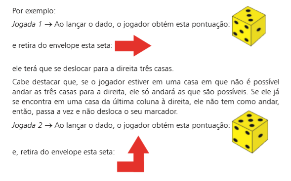 uma ou mais crianças devem executar esta ação, ou seja, deslocar-se para a direita tantos passos quantos os sorteados em um dado. Com isso, o professor vivencia com a criança os principais movimentos de deslocamentos no plano previstos nas indicações das fichas do jogo.
