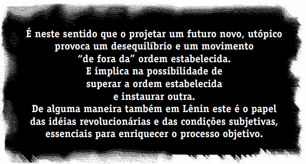 Contudo, as Utopias dizem, por isso mesmo, da falta que sentimos, do desejo, do sonho, do que embora não esteja aqui (hic et nunc – aqui e agora) poderia, em outras circunstâncias, em outros tempos – especialmente tempos futuros ou tempos míticos no passado – vir a ter ou ter tido lugar. Significa que toda a história é lugar também de certa frustração, que nos impulsiona à busca permanente da esperança que continua a fazer o que espera.