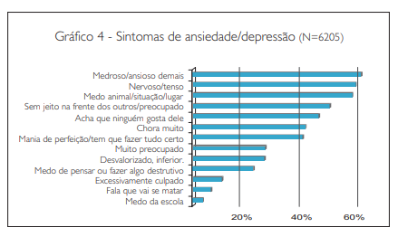 O gráfico 4 mostra sintomas compatíveis com transtornos de ansiedade de separação, generalizada e fobia específica. Como se pode notar no gráfico 4, isoladamente alguns sintomas se mostram muito comuns, como é o caso dos sintomas de ansiedade, nervosismo, tensão e medo, referidos pelos responsáveis de cerca de 60% das crianças. No pólo oposto, medo da escola foi referido por 3,7% dos responsáveis.