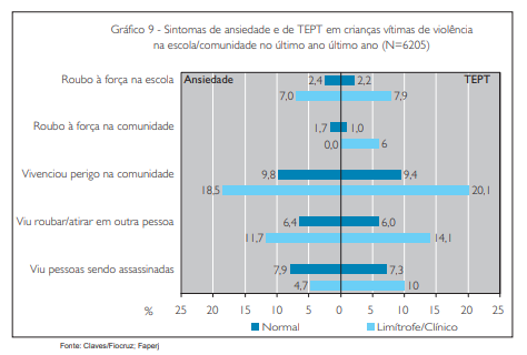 Essas formas de violência podem alcançar a criança nos seus diversos âmbitos de convivência, ou seja, no seu seio familiar, escolar, na vida comunitária e na sociedade em geral. Além dessas formas de violência, crianças estão submetidas à violência estrutural em uma sociedade profundamente desigual como a brasileira. No gráfico 9 vemos que os sintomas ansiosos e de TEPT são mais frequentes entre as crianças que passaram por quase todas as formas de violências ocorridas na escola e comunidade.