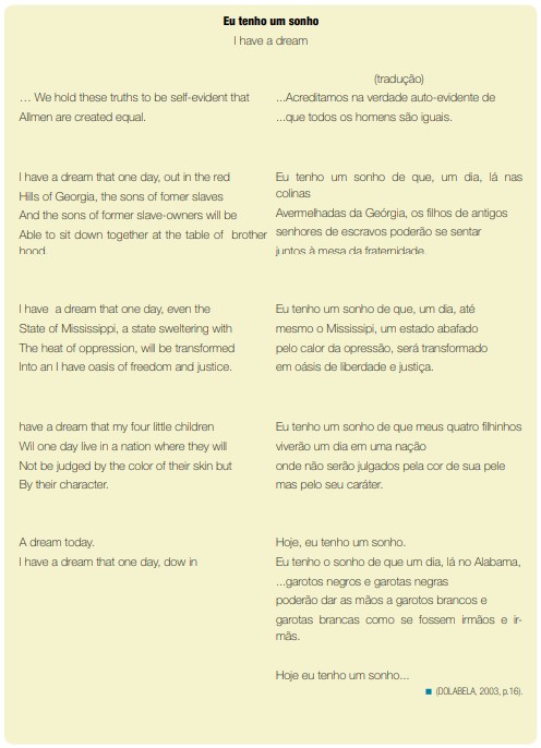 Por meio do Surrealismo podemos manifestar livremente todos os nossos sonhos. Como podemos ver, a marca do Surrealismo é a visão mágica da realidade, a exaltação da irracionalidade, do imaginário, e o mundo dos sonhos. Qual é o seu sonho? Martin Luther King, um importante líder do movimento pelos direitos dos negros americanos, por exemplo, lutou para realizar um grande sonho, a conquista da igualdade dos direitos humanos por meio de ações pacíficas. Por suas ideias contra os preconceitos, principalmente o racial, Martin foi assassinado em 1968, aos 39 anos. Mas, afinal o verbo sonhar significa sempre a mesma coisa? Ele também tinha um sonho que expressa o desejo coletivo pela paz e pela igualdade. Vamos ler?