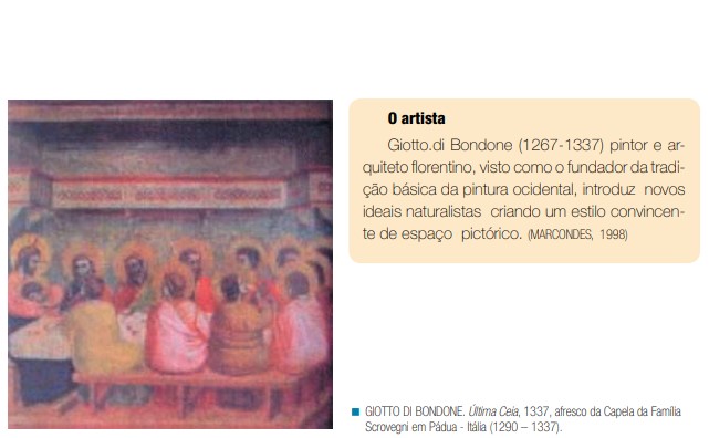 Giotto e Rego Monteiro, nas suas composições com o mesmo tema, não fazem uso da perspectiva tradicional (do Renascimento). Observe nas obras, que cada artista representou o tema de formas diferentes. A obra Última Ceia de Giotto aproxima-se da ideia de representação do real de Leonardo, apesar de apresentar uma estrutura formal ainda sem perspectiva, como a convenção religiosa da época exigia para expressar santidade. Observe como Giotto coloca os apóstolos sentados nos dois lados da mesa, enquanto Rego Monteiro, inspirado em Leonardo, os colocam de um só lado, de frente para o observador. Sem o domínio da perspectiva, Giotto representa a auréola das figuras, como um círculo sem perspectiva.