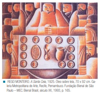 Observe que Rego Monteiro artista do modernismo brasileiro, por sua vez, representa, sem a perspectiva tradicional, a cena. Os pratos são vistos de uma vista superior, enquanto o jarro e o
