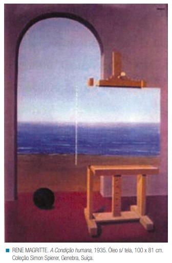 Na obra A Condição Humana, a realidade e a sua representação misturam-se. Veja como o cavalete se integra com a vista do mar e da praia, que aparece além da janela. Construa um texto apontando algumas características do Surrealismo de Magritte. Leia seu texto para a turma e faça uma síntese com todas as características destacadas pelo grupo.